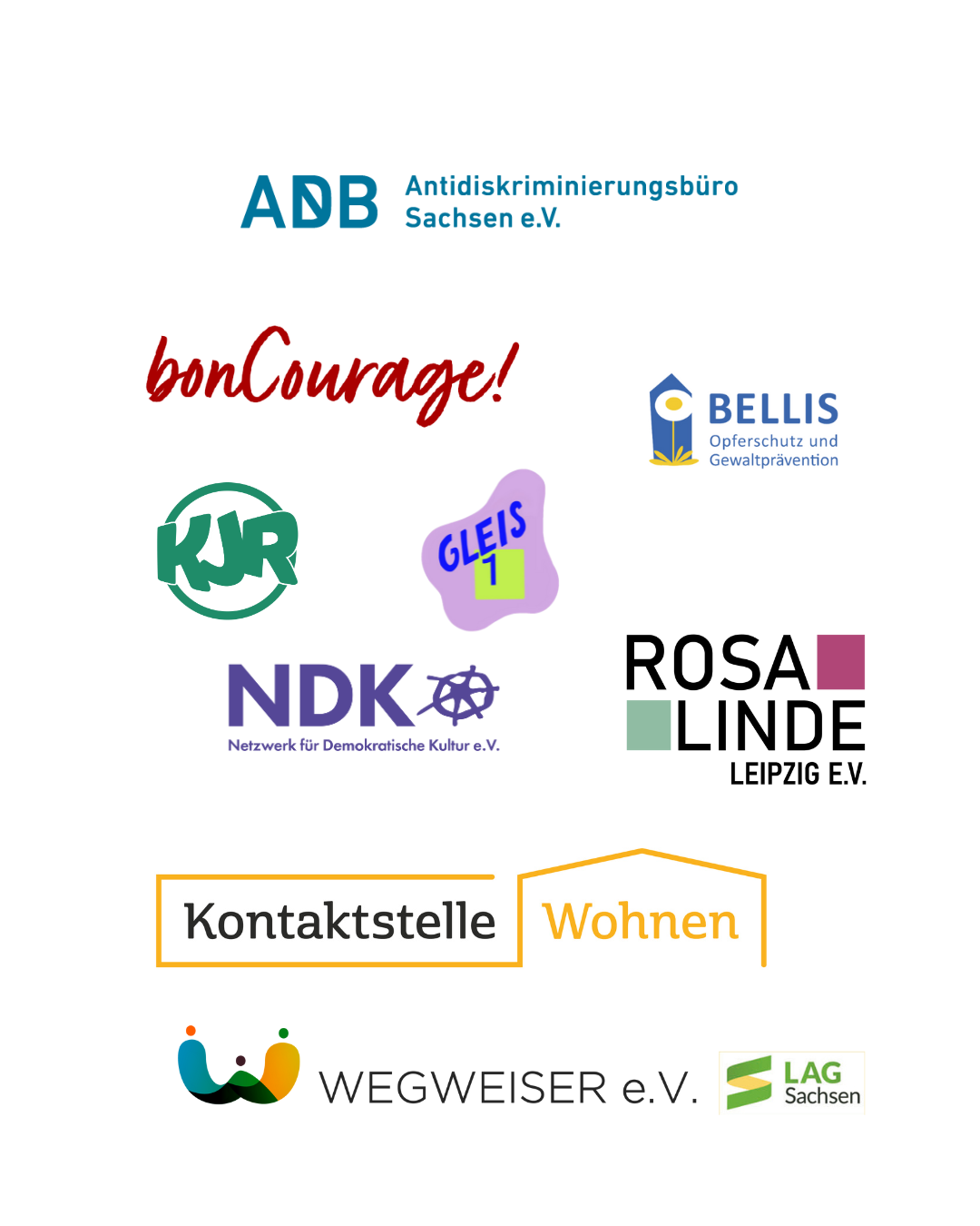 Neun zivilgesellschaftliche Akteure aus dem Landkreis Leipzig, die in unterschiedlichen Feldern aktiv sind, treten dem Bündnis „Gleichstellung – #unverhandelbar“ bei. Folgende Organisationen haben sich gemeinsam zu diesem Schritt verständigt: Antidiskriminierungsbüro Sachsen e.V., Bellis e.V., Bon Courage, Gleis 1, Kinder- und Jugendring Landkreis Leipzig e.V., Kontaktstelle Wohnen, Netzwerk für Demokratische Kultur e.V., RosaLinde Leipzig e.V., Wegweiser e.V.